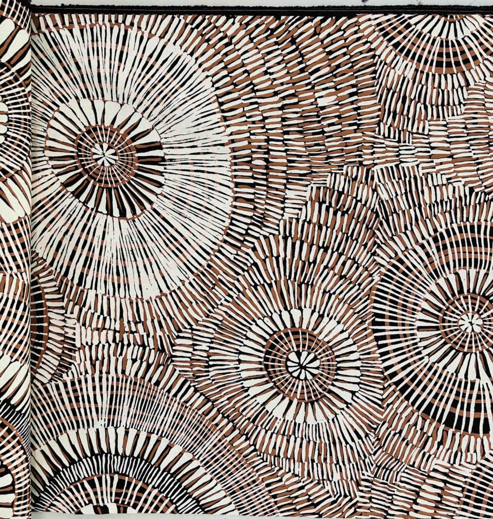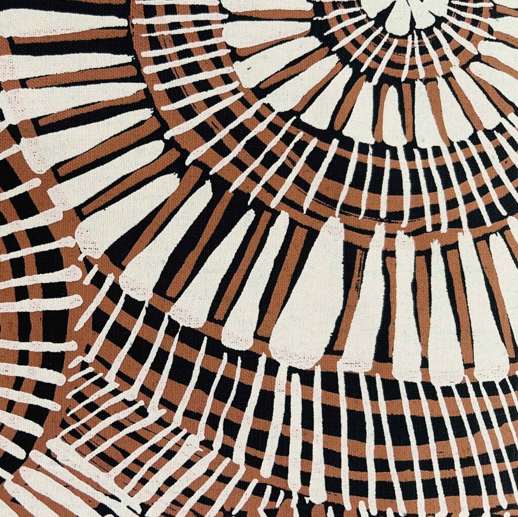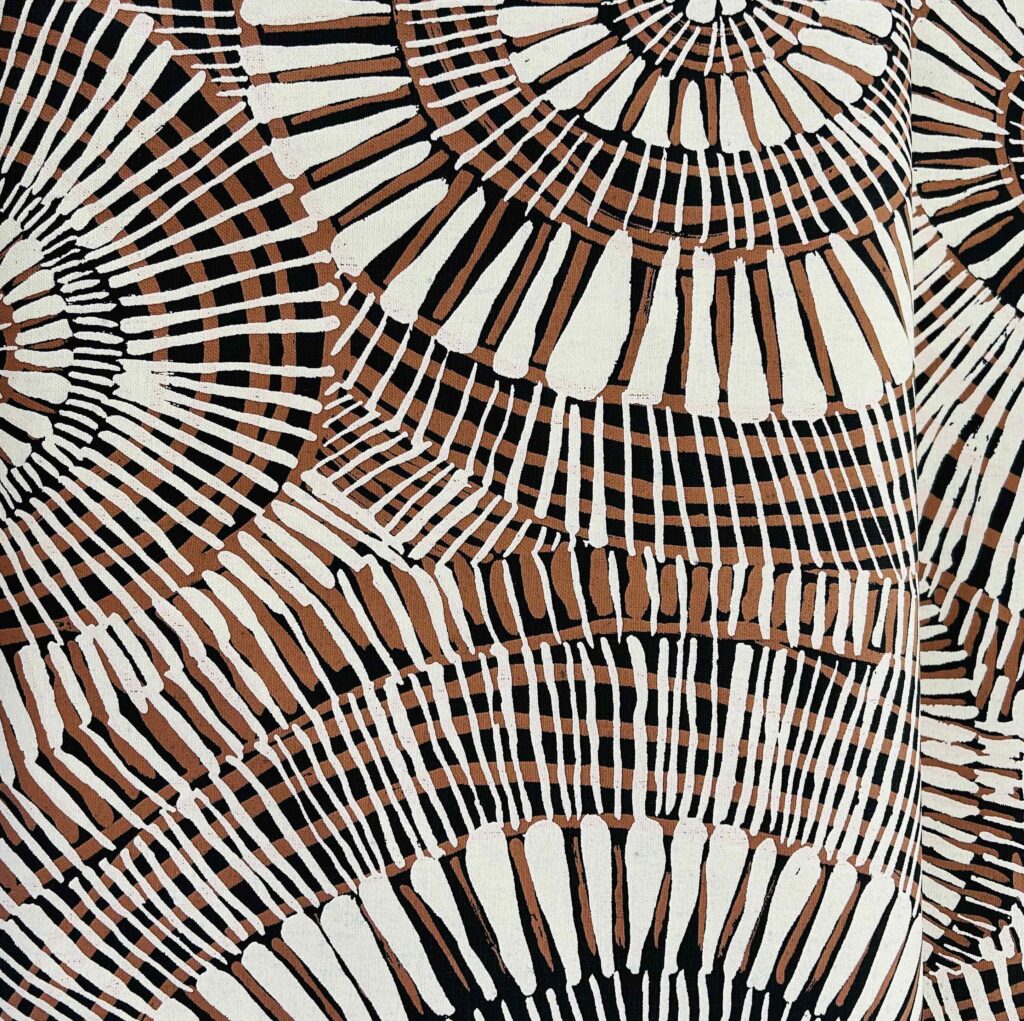 Marita Sambono was born in the old Daly River hospital within the mission. She went to the mission school and worked in the Health Clinic after leaving school. Marita is married with three children. The family moved to Darwin for a while, she returned to Daly River with her family and shortly commenced work at Merrepen Arts. Marita Sambono is known for her paintings on canvas, silk and textile designs which are based strongly around the culture and customs of her country. She also paints religious themes. In 2013, Marita Sambono’s fabric design Fog Dreaming was crafted into a dress by Raw Cloth, Darwin, and was awarded first prize in the Myer Melbourne Cup Fashions on the Field.