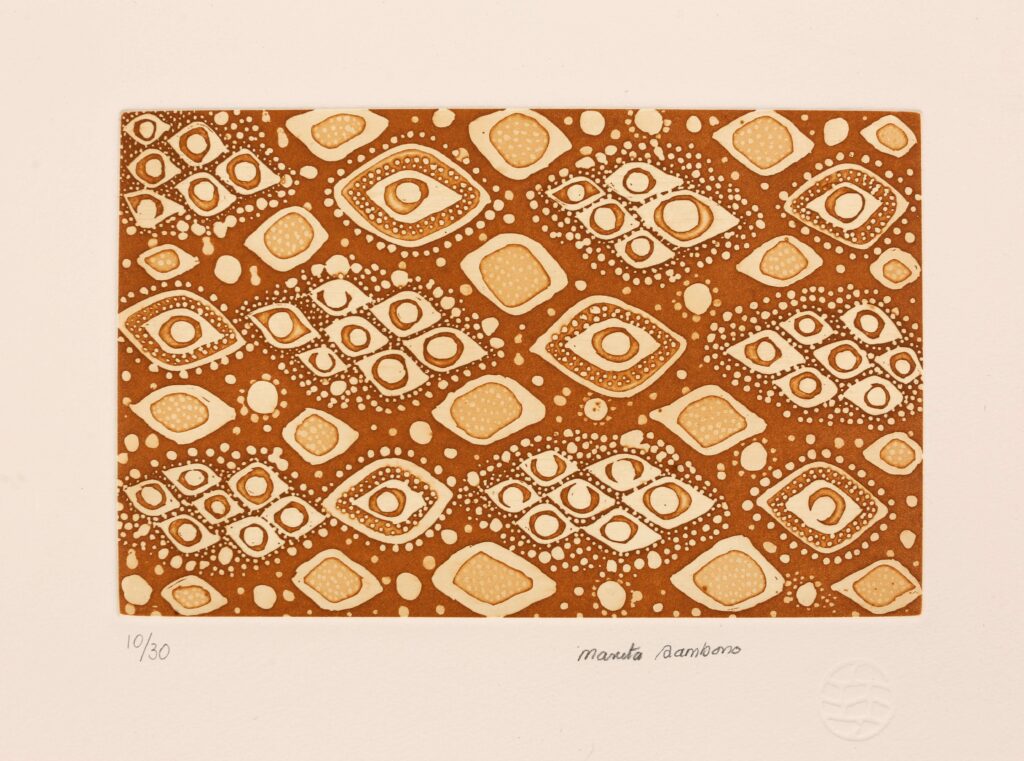 Marita Sambono was born in the old Daly River hospital within the mission. She went to the mission school and worked in the Health Clinic after leaving school. Marita is married with three children. The family moved to Darwin for a while, she returned to Daly River with her family and shortly commenced work at Merrepen Arts. Marita is known for her paintings on canvas, silk and textile designs which are based strongly around the culture and customs of her country. She also paints religious themes. In 2013, Marita Sambono’s fabric design Fog Dreaming was crafted into a dress by Raw Cloth, Darwin, and was awarded first prize in the Myer Melbourne Cup Fashions on the Field