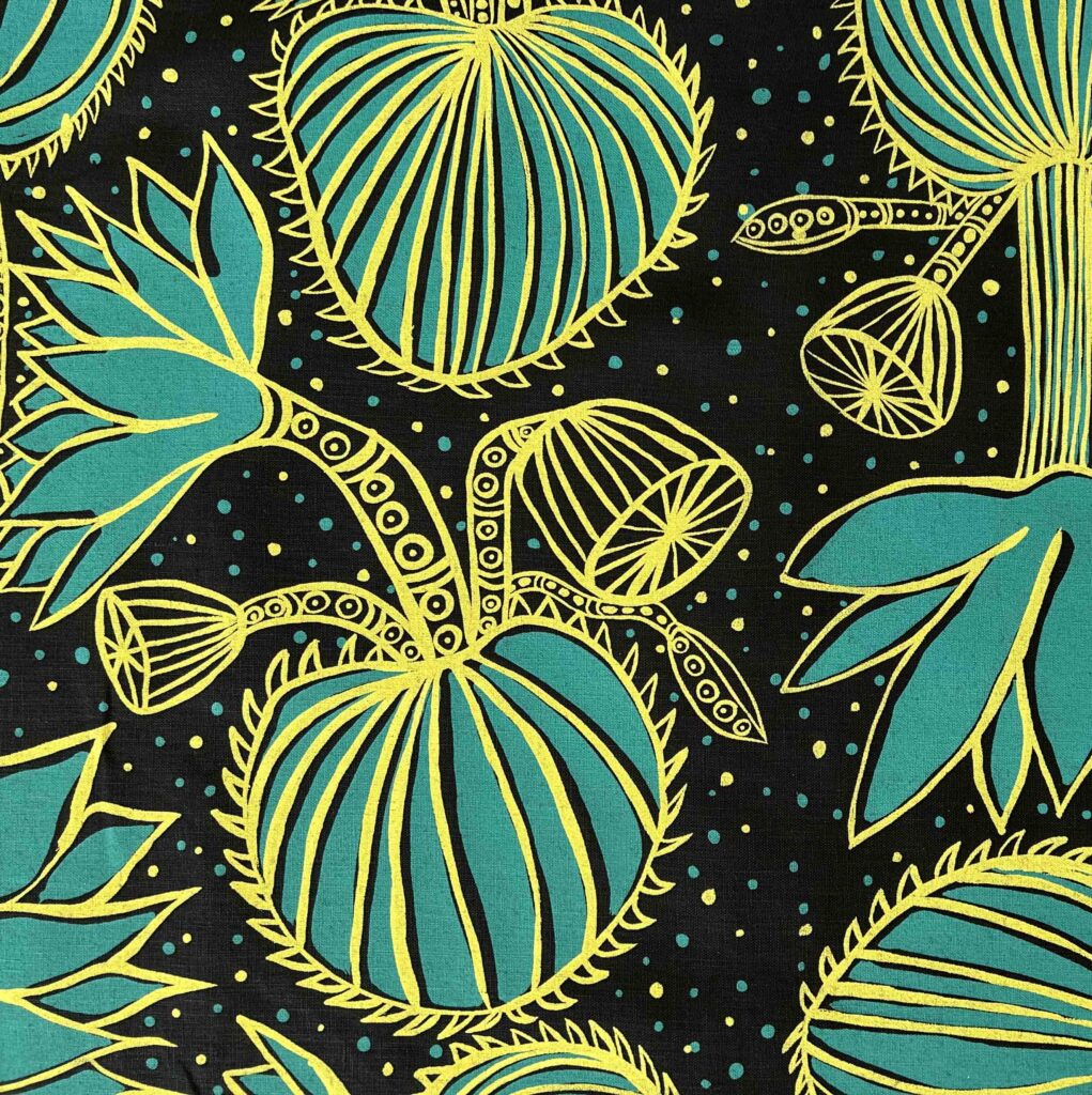 Nola Jimarin – Water Lilies on black linen (per 1m)